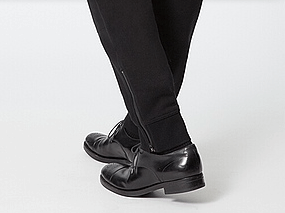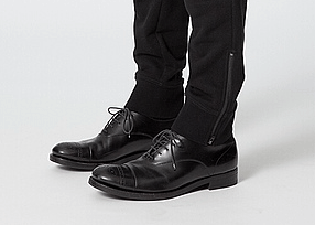 このジョガーパンツをカジュアルアップさせて、革靴を合わせます。